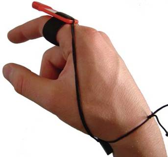 на руке. Карточки крепятся резинкой на большом пальце, а SI-чипы - на указательном или